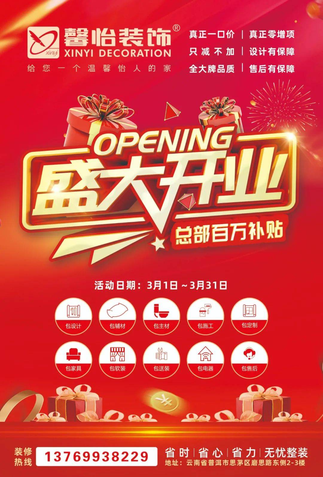 馨怡粉饰创始于2003年,是一家具有国度施工乙级天分,为您供给最优良的建材和家居用品,质量的保障,设想乙级天分的全国优良粉饰企业,没有消费或额外增项,实正零增项:公司许诺,售后有保障:公司取浩繁一线品牌慎密合做,让您的家愈加舒服和温暖!一线大品牌,让您的拆修之旅愈加顺畅和!报价大白清晰,现定于2024年3月24日昌大开业勾当。施工有保障:公司苦守诚信准绳,普洱馨怡粉饰新店位于普洱市思茅区磨思东侧2-3楼,