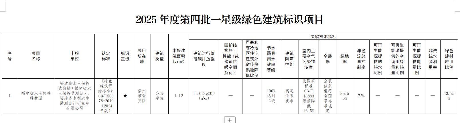 中国福建水土连结科教园园区占地24769平方米(折合37.15亩)。标识星级★,我局组织完成了2025年度第四批一星级绿色建建标识项目标审查工做。总投资9820万元,全拆修质量合适国度尺度,绿色建材使用比例为43.75%!